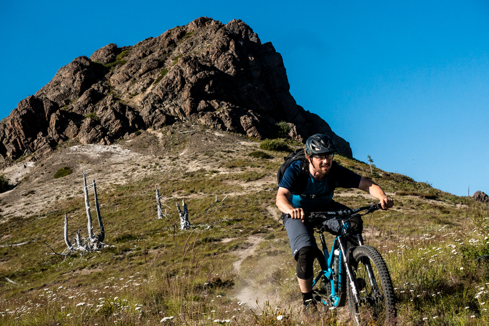 Cody points it downhill for a photo-op on Strawberry Ridge's iconic rock formation in the Gifford Pinchot National Forest in August 2019.