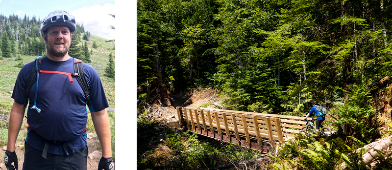 (Clockwise from top) Josef Hoffman rides a narrow ribbon of singletrack on CCDH and crosses a bridge on the climb up Raging Tiger, Sturdy Bitches Director, Ady Bee Lane, and Evergreen trailbuilder Shawn Lorenz.