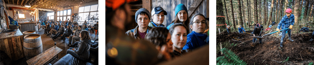 The group learned core principles of trailbuilding in a classroom setting followed by an afternoon working on Raging River's new Canyon Creek DH.