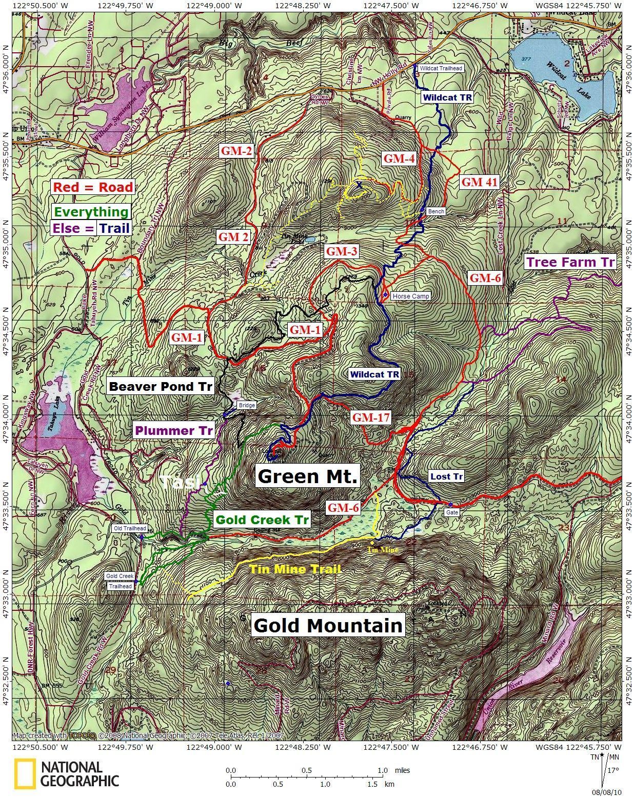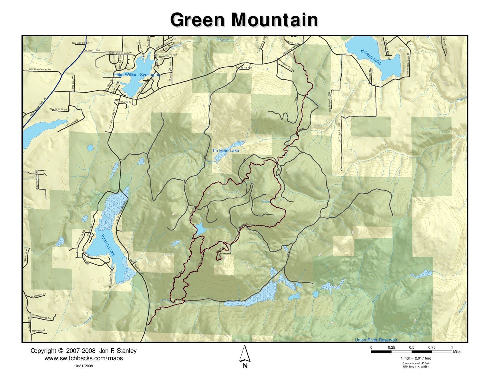 A trail system in Kitsap County on DNR owned Green Mountain. Climb Wildcat Trail for 1100 feet of gain in 4.5 miles and get a great view of Bremerton, Seattle, and on just the right days, Mt. Rainier and Mt. Adams.