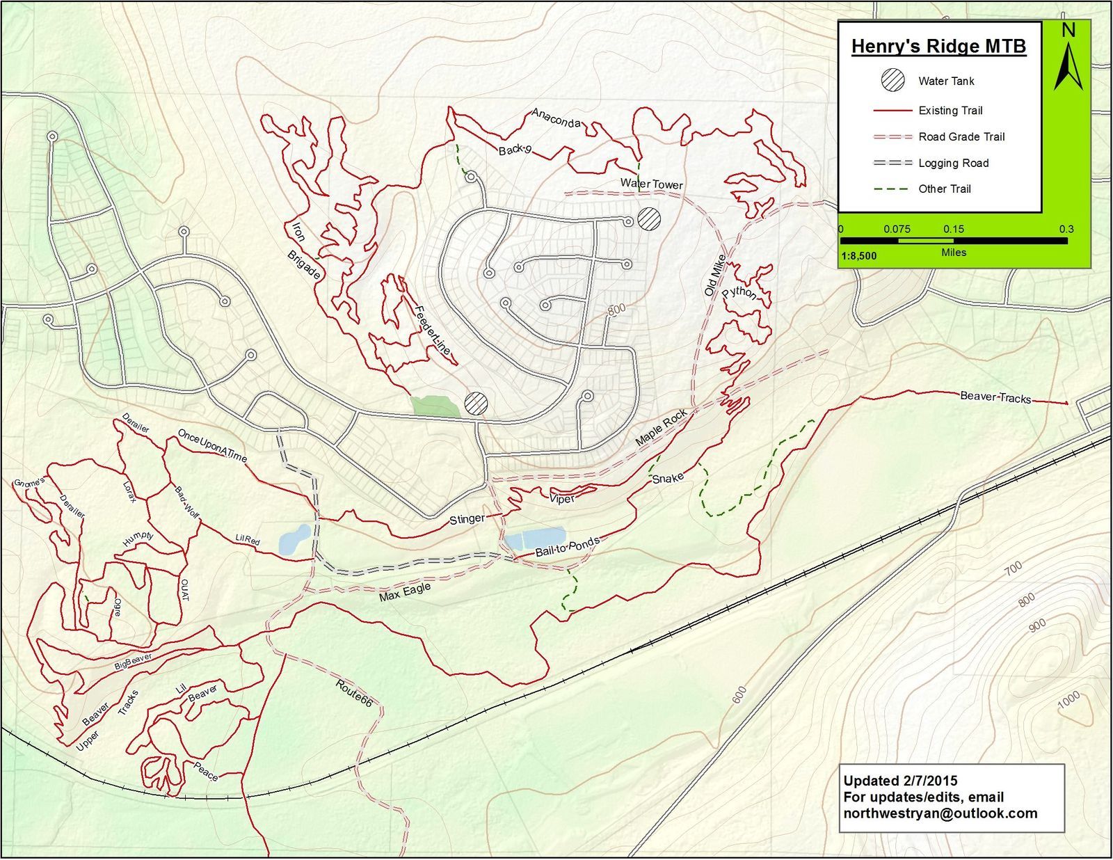 First time riding Henry's Ridge. Entered the trails next to the Water Tower. Went up trail (name unknown to me), then went on Anaconda, Python, Snake, Connector, BeaverTracks, then Beavertracks Loop. Ended up at an intersection at end of Beavertracks loop that also had a trail called Lil Red (whi...
