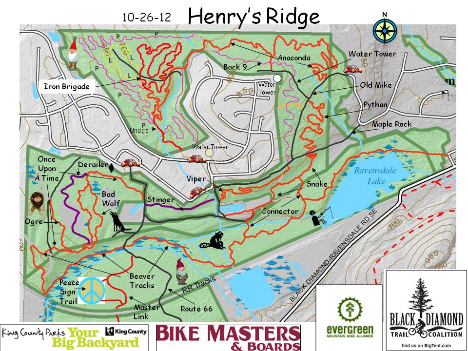 King County have started what they call Forest Stewardship work ( logging ) on Henry"s Ridge & have closed access into the all trails north of the ponds & east of the water tanks while they do the work .Effectively , though, all the trails in the original Henrys area are either destro...