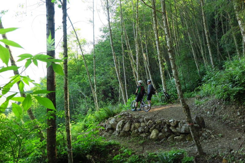 The trail then changes to road-trail conversion before climbing a rock cliff, but promises to be a stunning section of trail. The road-to-trail conversion is one of the best around, with undulations, camber and grade reversals, and naturalized vegation and rocks. There is a charming waterfall cascading down alongside the trail at one point.