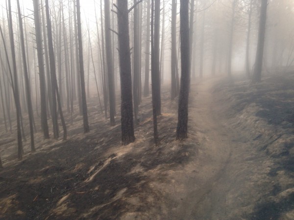 After doing the Butte in the morning, I went over to Echo Ridge to take advantage of the day before the rain. I parked at the Upper TH and did Nowhere to Hide and Big Critter and started the Outback counterclockwise. Near the end of the outback loop, a new trail was a nice diversion back to North Junction. I joined up with the Dust to Glory trail and saw the extensive fire damage all along that trail. The fog kept the vistas to zero but the temperture was perfect for a ride. There was a significant amount of loose sand added to the road to repair it near Quickstep Crossing. As with the Butte, burnt forest is everywhere around the North and East of Echo Ridge but the trails still exist. The cleared foliage also makes trail routing a little easier.
