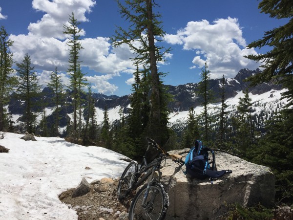 the trail was awesome, their were a dozen or so trees down on the way up but while I was riding the forest service cut most of them off the trail and by now probably have all of them off. the creek crossings are very wet and the last 1/2 mile or so up to the pass is covered in snow still and the next 1/2 mile before that the trail is basically a creek from all the snow melt. I blew out my rear tire and sheered the cleet off of my shoe basically right from the top and had to ride down on a mangled tire and only one foot clipped in most of the way down. Will return in a couple of weeks for hopefully better luck.