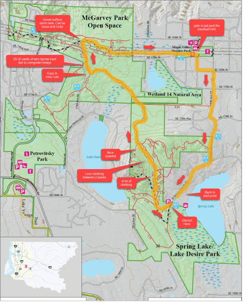 My daughter (16) and I rode these trails for the first time today and had a great time. The trails are not marked at all so remember to print and bring the trail map. We did a loop as shown in the picture attached. It took us 90 minutes but we took our time and had several stops. If you ride it without stops, it will probably take 45 to 60 minutes. To minimize climbing, we rode between the 2 peaks. There is nice variety with the loop we did - packed dirt, little bit of roots and rocks, grassy, old growth forest, gravel and at the end, roads. Great single track for beginners. We will come back again - probably go faster next time as we are more familiar.