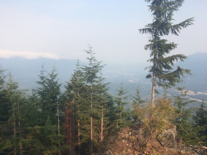 Had a wonderful time on the new trail even with the hazy valley below. The incoming rain front was just crawling over Rattlesnake and then evaporating. It was an impressive transition into Fall. I only made it to the major switchback after the Mt Washinton trail junctions, and frustrations with a failing dropper and time constraint helped me turn around for home. The ride was enjoyable and I'll be back to make it an epic next time. Great trail folks. It's like Tiger's Masterlink going up and Preston going down. Too bad the terrain doesn't allow more banked cornering to keep the speed up. Track and hazy pics here.