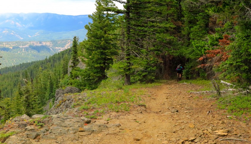 Lots of loose rocks, some sandy/dusty spots but in good biking condition considering that it's open to motos. No trees down.