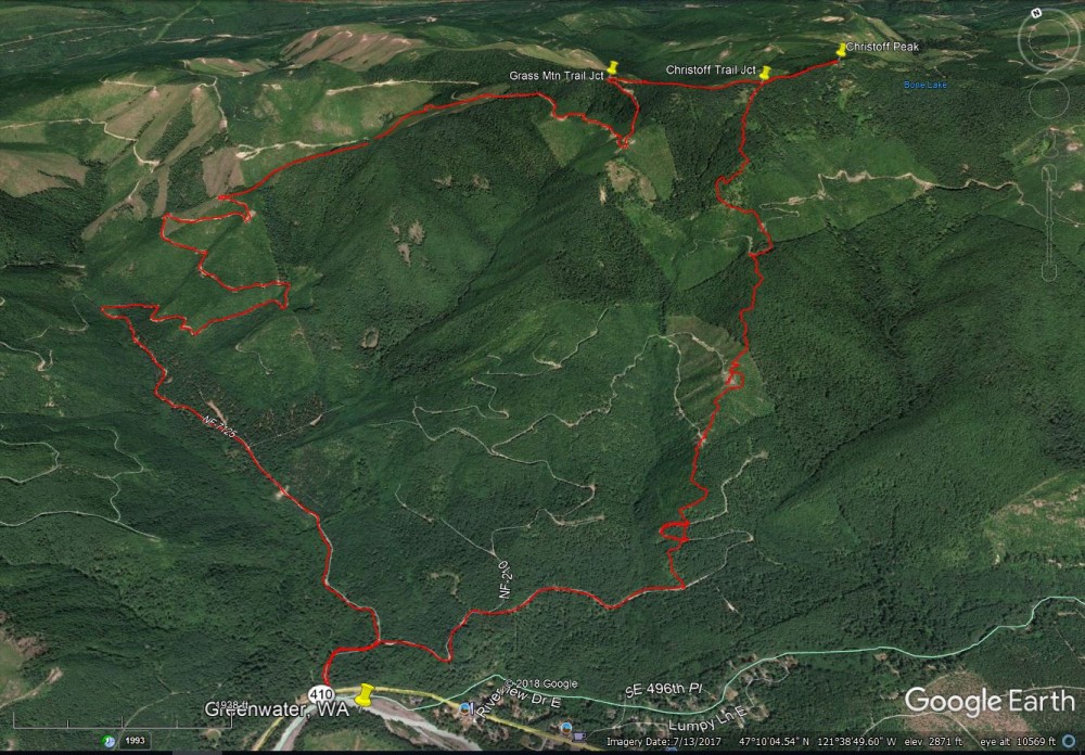 Rode this trail this morning. I parked off of SR-410 and climbed (snow free) to the intesection of the Divide Trail and FS road 7125. Moto's have chewed the Divide Trail up a bit and snow is still over 40% of the trail on your way to the peak. The Christoff trail down is clear of snow except for a couple spots right at the top. The soil is a little loose but trackable. Make sure you got good brakes and favor the front! Avoid tail draggin'! The trail has endured a lot of it. There is limited visibility and slowing down is a must to be safe. The cloud ceiling was 5000' so I missed all the gorgeous views of the peaks so I'll be coming back again some sunny day. Track and pics here. It is not for the inexperienced!