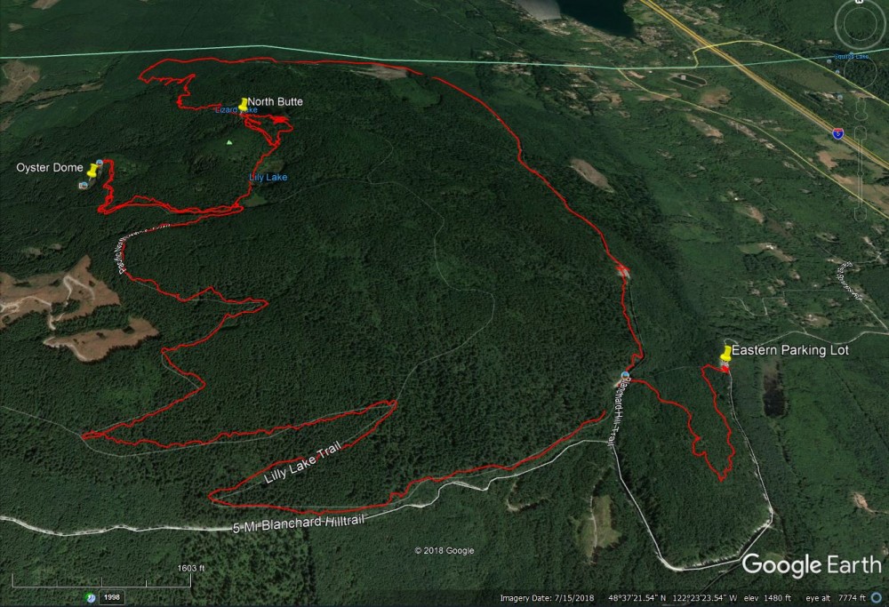 Started this ride at the lower Blanchard Forest trailhead lot and climbed the Lower Lily Lizard trail to the upper lot. I then took road 1000 north around Blanchard Mountain to the British Army Trail where I began the climb to the lakes and summits. About 5 miles into the ride and halfway up the British Army Trail, I lost the linkage between cassette and hub and now had a 29" Razor scooter. It was a little bit of a hassle for sure but the forest is beautiful and I still had the bike for the glides and downhills. The soils are well drained and the tread was a little bit of everything. As you'd expect, it is similar to the Anacortes and Galbraith terrain. I stashed the bike at the base of each of the summit spurs and summitted both the North Butte and Oyster Dome (hike only trails) and then continued back to the car. The views from up there over the Sound and San Juans are gorgeous. The GPS track and pictures are here.