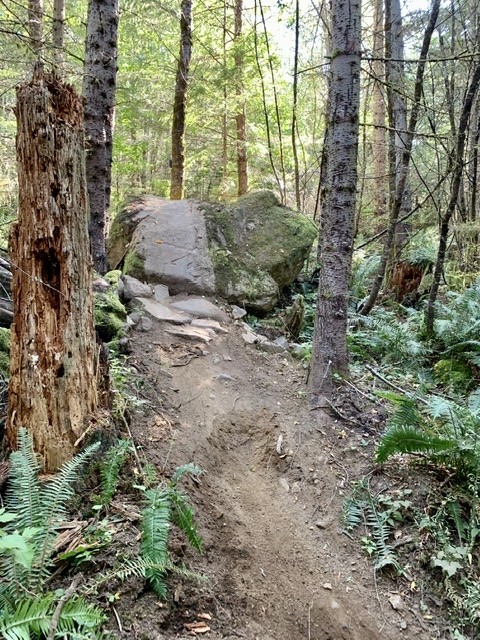 I rode the new Canyon Creek DH this morning, and Raging Tiger back up. CCDH is long with rooty technical gnar, some steep powdery switchbacks and a bermy flowy final section down to the river. I'd call this a blue plus or black minus, maybe dark blue or grey. It's similar to No Service without the two super techy sections, but feels a lot longer. You can really see Evergreen's new agile trail development here. Much of this trail feels barely there, and it'll change as it gets ridden in. There's a black rock roll towards the bottom (see pic) which feels like the signature feature.