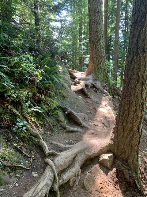 I enjoyed the mud and large puddles on Inside Passage, Joy Ride and NW Timber this morning. Really muddy and wet, chilly until you start moving but "If you're riding in the PNW you're riding in the rain." The off camber root roll about halfway down NW Timber (pic from June) has gotten treacherous and unsafe. There's major exposure downhill should you fall. Evergreen needs to build this up, before someone gets seriously injured. Unsafe!