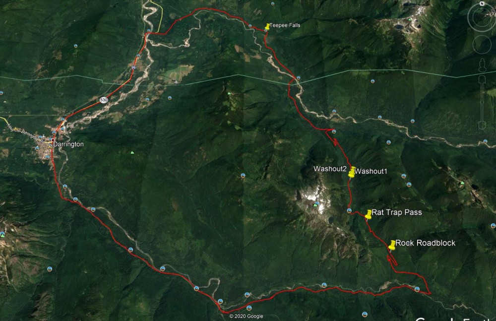 Just east of Gold Mountain are Prairie and White Chuck Mountains and Rat Trap Pass (3160'). Along with the Mountain Loop Hwy and SR530, when you add Forest Service Roads 23, 27, and 25, and Suiattle River Road, you have a wonderful 45 miler way off the beaten path. This loop was my last bucket list gravel ride for 2020 (with altitude) and the new snow turned it from gravel tires to the wider ones for climbing and safety. Since I didn't know how much snow was back there at 3100' I wasn't sure if the loop was possible. I parked at the Beaver Lake trailhead, instead of downtown Darrington and went to the entrance of FS-23 at 6:30am with lights blazing. Roads were damp but good until about 2000' where a dusting of snow and slushyness started. White Chuck Mountain provided a little shadow so I only saw about 4" of snow at the Rat Trap Pass but it was enough to make the descent, on the other side, a little dicy. The road has a lot of damage after the Pass summit so it was good to have the full suspension and bigger tires. But after the descent, the knobby tires were a hassle for the 30 miles remaining back to the car on pavement. For you gravellers, do this next Summer if you are looking to get away to someplace new. There are a couple slides and eroded sections of road so vehicles are not able to do the whole loop, only 2 wheelers. It was a beautiful ride but probably even better without snow and in July or August. GPS Track and pictures are here.
