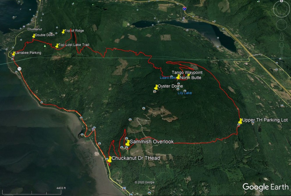 With snow covering all our peaks and wet weather hindering our traction, I decided to just go exploring. I found a weather window and I planned a route to cover single track at the Blanchard State Forest, along with single track at Larrabee State Park, and then enjoy the views of the Sound along Chuckanut Drive. I started at the Upper Blanchard Lot and headed up the east road to the Tango Waypoint and descended the British Army Trail and Lost Sailor Trail and then began taking roads and trails to finally end up on a section of the Lost Lake Trail in Larrabee to climb and descend down to the Double Down trail. All the roots and rocks today were greasy and Double Down was a little too risky for me in a couple spots but was enjoyable. After reaching the trailhead and lot, I began the ride down Chuckanut Drive (not much shoulder in spots but traffic was minimal) to get to the steep switchback trail that climbs to the Samish Overlook for the views. That trail section was mostly hiking since the roots, rocks, and leaves were too obstructive for finding a good climbing rhythm. Once at the Overlook, I got my pictures and then started back to the car by trail but ultimately stuck to the road to get to the car and my lunch quicker. No rain today, just a little less traction than I wanted. The GPS track and pictures are located here.