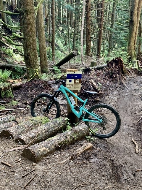 Tiger on the weekend is a recipe for crowds, no parking and noobs. I'm a weekday rider, and that again paid off today at Tiger to ride EMBA's newly opened Atlas. I climbed up to Inside Passage, then spotted the Atlas trailhead off the trail on the right. Atlas is primarily cut by hand and by riders, so it's loose, soft and full of gnar. It's correctly rated blue, but I'd call it a dark blue or grey with some mentally challenging steep downhill switchbacks and lots of broken roots, stumps and rollable drops. It's physical, pay attention!