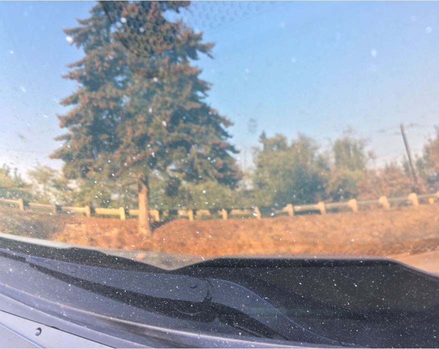 I've been away in LA for a week on a non-mtb trip so I went to the Gulch this morning at 7am to get a early ride in before the heat and ash made it uncomfortable. I made two runs down combining Boyz/Orion/Mukraker and then a full Boyz run. There are dry and sandy places until we get the rains, but it is still running well. The sun was glistening off of the larger ash particulates from the Hwy 2 fires and you could feel the difference in your throat after the ride. When I got back to the truck, there was a dusting of ash on the windshield along with the normal optical reflections (see image, misleads actual particle size! They were much smaller). It was still a nice morning ride.