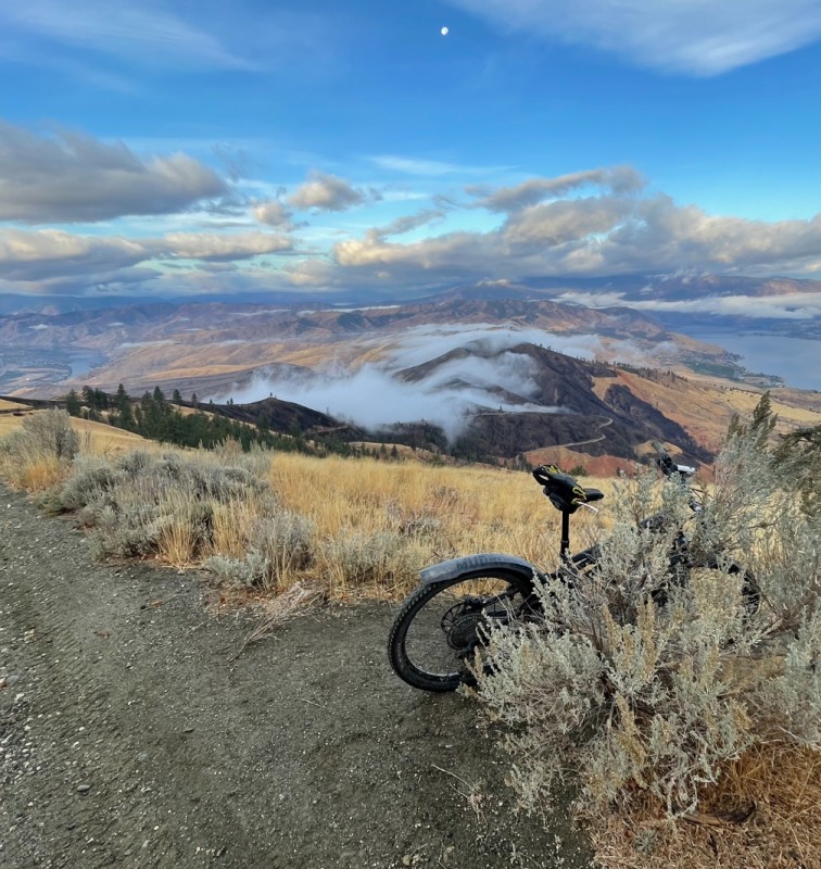 Our first, Fall, atmospheric river wave came through overnight but only showered on Chelan and made the downhill trail ideal for your tires. I started climbing from the trailhead around 6:30 this morning. After traversing over to the Butte road, I saw a deer family just before the pavement ended. Higher up, the fog and clouds were coming through the Butte Road gap and over the Stayman Flats burn scar and then evaporated quickly after getting through. It was a fascinating sight to watch. I saw a couple hunters up near the summit so be aware of hunting season at this point in the season.