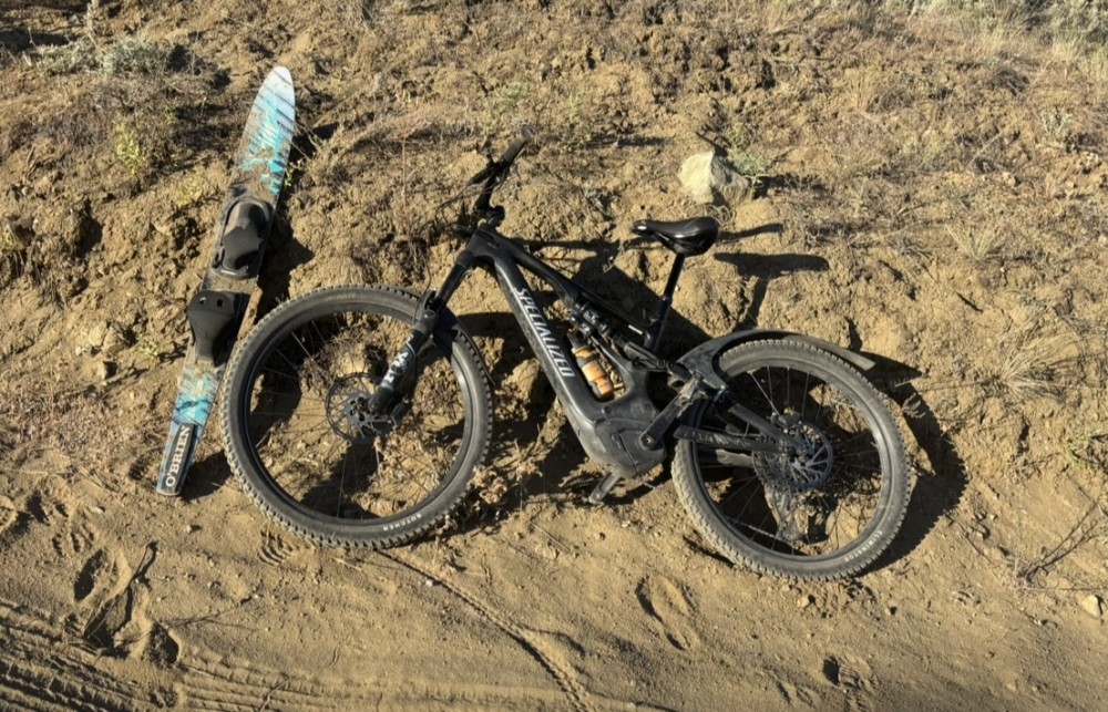 I started climbing around 6:30 this morning to reach the summit before the sun started getting really hot. Up on the road at that same switchback as my May 24 report described, that water ski was sitting in the grass so I repositioned it to be more visible for the next scavenger who is interested. The descent today was wonderful! Beautiful weather, grippy hard pack and no hiker interference to worry about. Just choose your line with the least amount of gravel and rock. The Trailforks ride log is here.