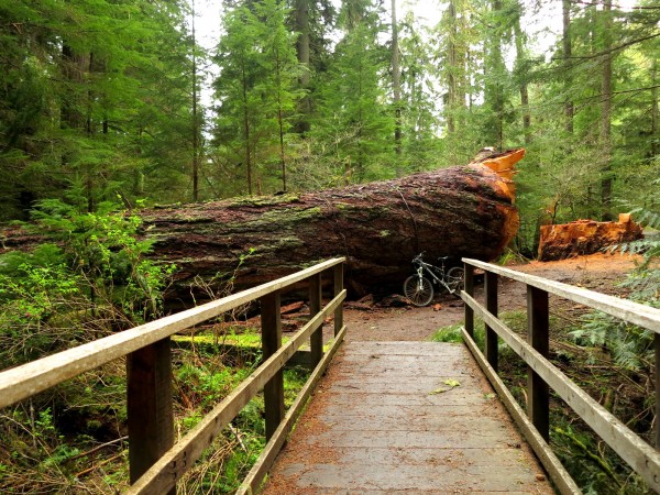 Skookum is drying out. No more standing water but still lots of soft spots. Big news is that the HUGE "Tourist Tree" tree located at the end of the campground(if you do the S/WR loop you ride right by it) has fallen. Looks like the FS did some chainsaw work to make it safe. Trail now rides between the stump and around the tree. Here are two other shots of the tree: